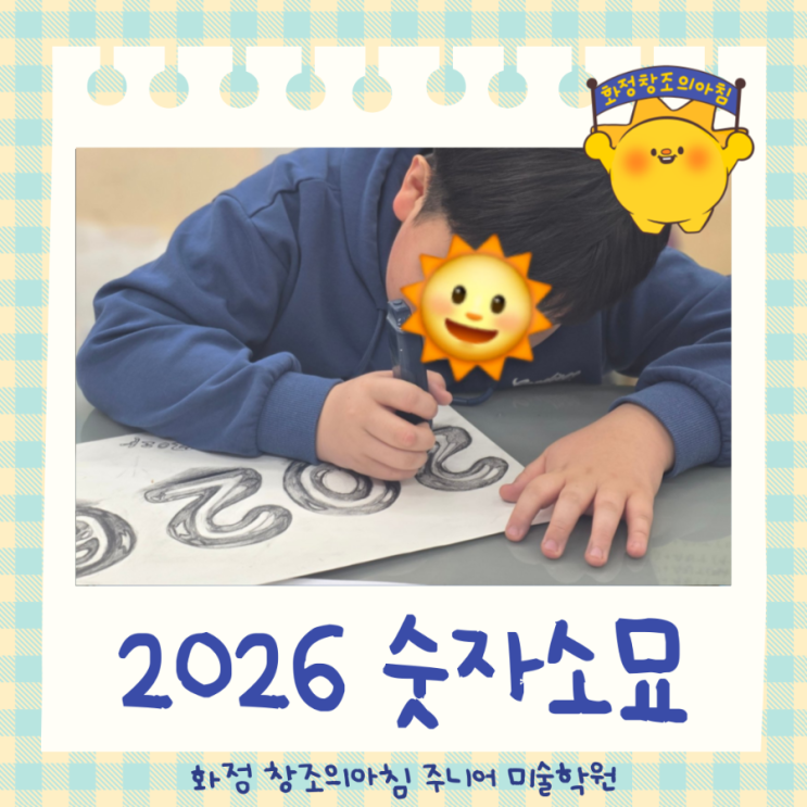 안녕하세요 , 햇살이에요 ! 경기도 고양시 화정동에 위치한 화정 창조의아침 미술학원 주니어반에서는 아이들의 창의력과 표현력을 쑥쑥 키워주는 다양한 초등미술 수업이 진행되고 있어요 2026년을 맞이해서 이번 수업에서는 쇠질감 숫자 소묘를 진행했어요! 관찰부터 차근차근 ~ 먼저 반짝이는 부분 , 어두운 그림자 , 빛이 닿는 면과 닿지 않는 면의 차이까지 쇠질감의 특징을 함께 살펴보았어요 ~ 아이들 스스로 관찰하며 이야기하는 모습이 인상 깊었답니다 ㆅ 숫자의 형태를 잡고 , 명암을 차근차근 쌓아가며 평면의 숫자가 입체적인 쇠 숫자로 변해가는 과정 ! ♡ 처음엔 어려워 보였지만 집중해서 그리다 보니 “ 어 ? 가까이....... <img src="https://blogthumb.pstatic.net/MjAyNjAyMDRfMTU3/MDAxNzcwMjA0NTI0NzQy.-E8NJLZVY3GskkhBg7KZiLy7A-YGiM3OeOF37AdYNOcg.M6VUrBmIn6mrxAuwxwE5sJ7ot6HdxqHLu40zAocR6awg.PNG/900%A3%DF%C8%AD%C1%A4%C3%A2%BE%C6%A3%AD%BA%ED%B7%CE%B1%D7%A3%AD%B4%EB%C7%A5%C0%CC%B9%CC%C1%F6%A3%AD001.png?type=s3" />