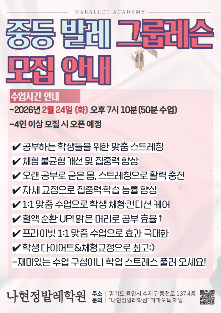 안녕하세요 나현정 발레학원입니다 저희 학원에서 2월 24일 화요일 오후 7시 30분! 중학생 그룹 발레 수업을 오픈하려고 합니다. 4인이상 모집 시 수업 오픈 확정이니 친구들과 함께 발레 수업 해보세요~ 친구와 함께 등록시 수업도 각각 1회씩 추가해드려요 학업 스트레스로 힘들고 몸이 찌뿌둥한 학생들에게 딱 맞는 수업 구성을 준비할 예정입니다. 발레학원에서 예쁜 발레 복도 입고 사진도 찍고 운동도 하며 매주 화요일마다 즐거운 시간을 보내보세요:) 수업 문의나 궁금하신 점은 나현정발레학원 카카오채널로 연락주시면 답장 드리겠습니당 <img src="https://blogthumb.pstatic.net/MjAyNjAxMjNfNzMg/MDAxNzY5MTUyMDI2ODg1.fMkDqX9mwRG4iUordERcZFPsxhgJoyf1G1f2dN9lTeYg.kt7_OqE7hAaMuKapaH1AEpsQib6_b_TQUDRmRGKmAJYg.PNG/%B1%E2%BA%BB%C5%DB%C7%C3%B8%B4_%2820%29.png?type=s3" />