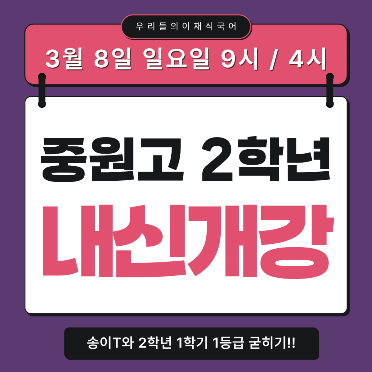 안녕하세요. 우리들의 이재식국어입니다. ^^ 중원고 2학년 단독 내신대비반 3월 8일 일요일 개강! 수능과 직결되는 1년, 이재식 국어학원의 완벽한 학습관리 시스템으로 내신 대비가 가능한 중원고 2학년 단독반을 소개합니다 중원고 2학년 시간표 & 담당 선생님 중원고 2학년 일요일 오전 9시~12시 일요일 오후 4시~7시 두 개의 타임 중 선택! 수업은 주 1회 3시간 클리닉은 월 2회 90-120분 진행합니다. ⭐ 해당 학교의 내신 출제 경향을 정확히 분석 ⭐ 시험 문제의 포인트와 서술형 채점 기준을 구체적으로 지도 ⭐ 학생별 취약 영역(독서·문학·문법)을 장기적으로 관리 단순 시험 대비가 아니라, 학교별 시험 구조를 이해하고 전략적으....... <img src="https://blogthumb.pstatic.net/MjAyNjAyMjFfNjYg/MDAxNzcxNjQ5MDM3MDg0.AcuOhhMNdfusXAvY7DDcnzvQ1ZCXAbUaI6GIMmYAd_Qg.cEGRAcvAHqL1cMBa-M9olzcnyHQuG9O-7ejnMwrgGV8g.PNG/%C1%DF%BF%F8%B0%ED_%281%29.png?type=s3" />