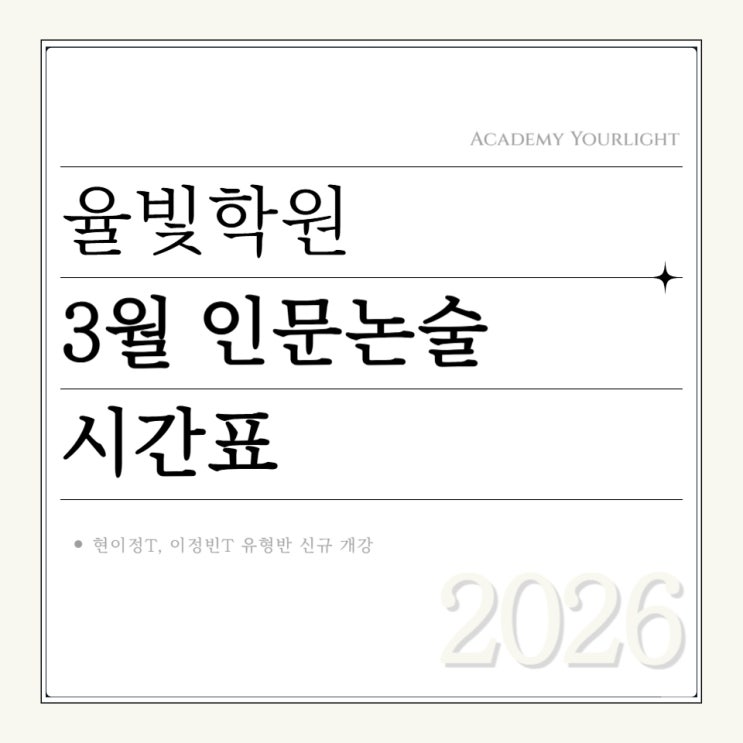 안녕하세요! 논술 학종 전문 율빛학원입니다 3월은 논술 준비에 있어 흐름을 다시 잡는 중요한 출발점입니다. 새 학년을 시작하는 학생들, 그리고 다시 한 번 도전의 길에 선 N수생 모두에게 의미 있는 시간이 될 3월 수업 시간표를 안내드립니다. (아래 유형반과 실전반 소개도 적어두었으니 참고해주세요✨) 3월 시간표 / 유형반 신규개강 ✅유형반 이후 실전반으로 진행(실전반 수업 8월 말까지 진행) ⚠️박예율T 토오후반 마감, 토오전반 마감임박 유형반 소개 당연한 이야기지만, 논술에도 '기본'이 가장 중요합니다. 기초를 다지지 않고, 무턱대고 기출만 풀게되면 오히려 돌아갈 수 있습니다. 율빛의 유형반은 논술에서 출....... <img src="https://blogthumb.pstatic.net/MjAyNjAyMjFfNzcg/MDAxNzcxNjMxNzk1OTIy.C1DbzaXCn3z1URaPopPKXUFlPOUtG-qqDPnCUASs4Kkg.6eLhL9KWkk2m32Wg_4jMAjZY2ZV2A17TWuvnYbn9blQg.JPEG/%C1%A6%B8%F1%C0%BB_%C0%D4%B7%C2%C7%D8%C1%D6%BC%BC%BF%E4_-001_%2811%29.jpg?type=s3" />