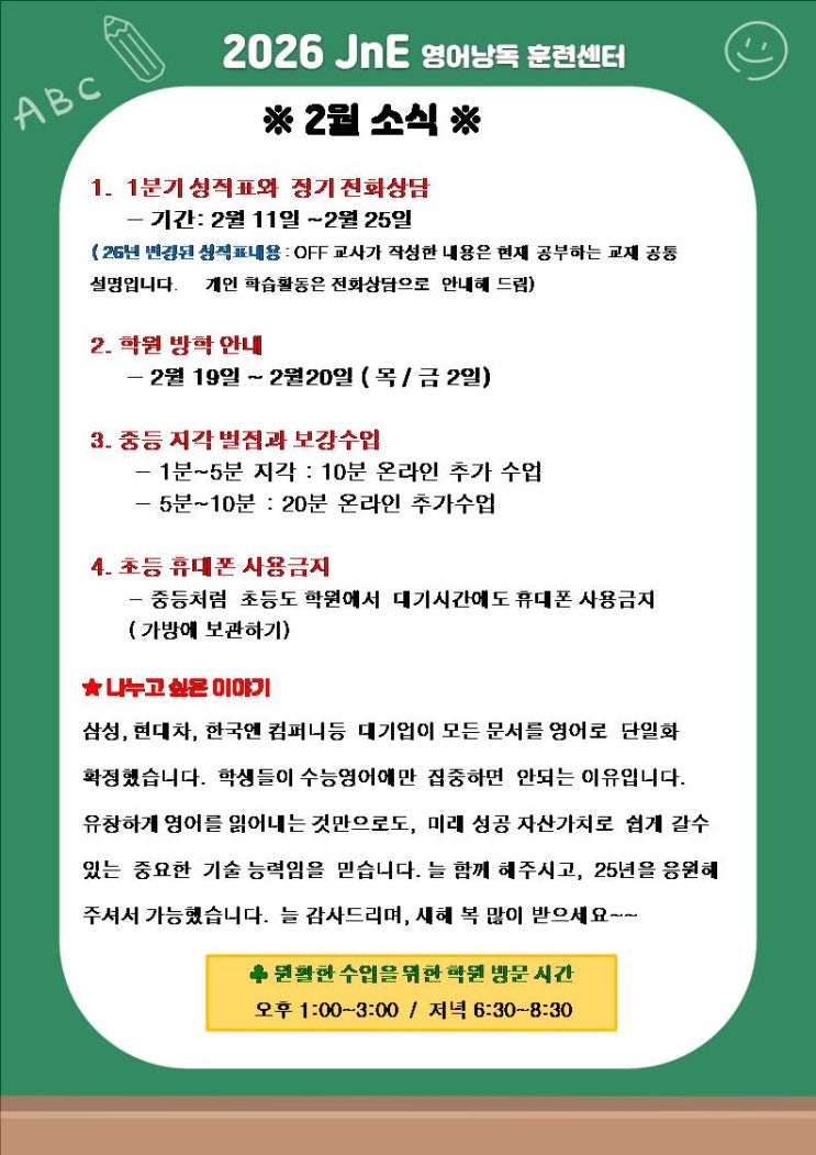 AI가 코딩을 알려주고 통신문도 만들어주고 학생성향도 분석해주고 진로도 제안해주고 ~~분명 미래교실은 지금과 다를것입니다. 하지만 아무리 교실이 똑똑해 져도 "참 멋진 시도이고 실수이지만 의미있었단다" 라는 교사의 엄지척은 절대 바뀌지말아야하는 교육 현장입니다~~ 늘 도전하고 무너지고 배우는 교사와 학생을 응원합니다 ♡ 영어낭독훈련센터 JnE <img src="https://blogthumb.pstatic.net/MjAyNjAyMTFfMjA4/MDAxNzcwNzgwNDM5ODE2.QAJySx7blC5j3AxApYmxE7IGb_azuVpbkKrZVeyacA8g.Vg7MAyN5CHwUqmFQE7AIPWhrjA_9mRIvhtqOy4tDPKkg.JPEG/1770780354104.jpg?type=s3" />
