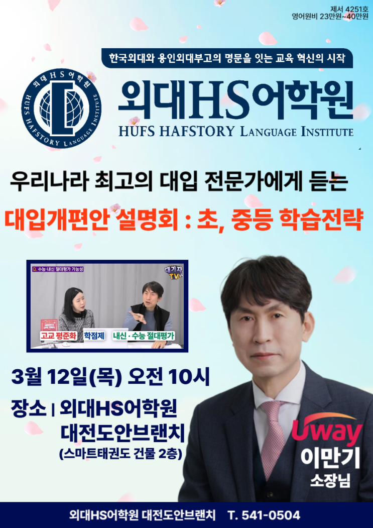 안녕하세요? 외대HS어학원 대전도안브랜치 대표원장님입니다. 2026년 첫 입시 설명회를 대한민국에서 가장 유명하신 유웨이 이만기 소장님을 모시게 되었습니다. 정말 재밌는 설명으로 어려운 입시를 쉽게 풀어서 설명해 주십니다. 다가오는 변화된 입시 정책을 정확하게 이해하고 우리 아이들의 미래 직업을 미리 설계해 보는 시간을 가져보려고 합니다. 2026년 대전에서 보기 힘든 큰 설명회인 만큼 부모님들의 많은 관심 부탁드립니다. 내용: 변화하는 입시정책; 초.중등 학습전략 일시: 2026년 3월 12일(목) 시간: 오전 10시 장소: 외대HS어학원 대전도안브랜치 (우미린아파트 앞 스마트태권도 건물 2층) 설명회 신....... <img src="https://blogthumb.pstatic.net/MjAyNjAyMTFfNzYg/MDAxNzcwNzk2NDYyNjE5.XVVHSQsY8Tg9PSgfAUnbtBbjf4G_qZXJ1PVNLZQqEeMg.xRpWRE7YQFm-kGVNqz0AJnBeCBgyVXv9ijB7Xnz7gxMg.PNG/BandPhoto%A3%DF2026%A3%DF02%A3%DF11%A3%DF16%A3%DF54%A3%DF12%A3%DF1.png?type=s3" />