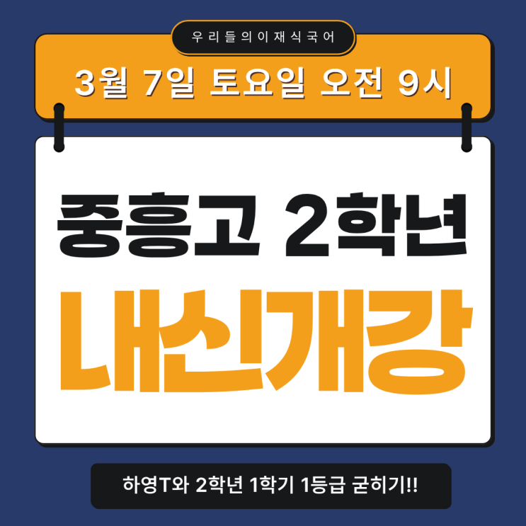 안녕하세요. 우리들의 이재식국어입니다. ^^ 중흥고 2학년 단독 내신대비반 3월 7일 토요일 개강! 수능과 직결되는 1년, 이재식 국어학원의 완벽한 학습관리 시스템으로 내신 대비가 가능한 중흥고 2학년 단독반을 소개합니다 중흥고 2학년 시간표 & 담당 선생님 중흥고 2학년 토요일 오전 9시~12시 일요일 오후 1시~4시 2개의 타임 중 선택! 수업은 주 1회 3시간 클리닉은 월 2회 90-120분 진행합니다. ⭐ 해당 학교의 내신 출제 경향을 정확히 분석 ⭐ 시험 문제의 포인트와 서술형 채점 기준을 구체적으로 지도 ⭐ 학생별 취약 영역(독서·문학·문법)을 장기적으로 관리 단순 시험 대비가 아니라, 학교별 시험 구조를 이해하고 전략적으로....... <img src="https://blogthumb.pstatic.net/MjAyNjAyMjVfODAg/MDAxNzcyMDA0MTE1Mjky.Rg-2pgWZ0iVa_8trTK62lMZ6Axrz6N19GVMI5G8MBBEg.qIC9DBLMvrEAZFbubLK9V4lCCkJSxdoR5WRq5UUDeHcg.PNG/%C1%DF%C8%EF%B0%ED_%281%29.png?type=s3" />