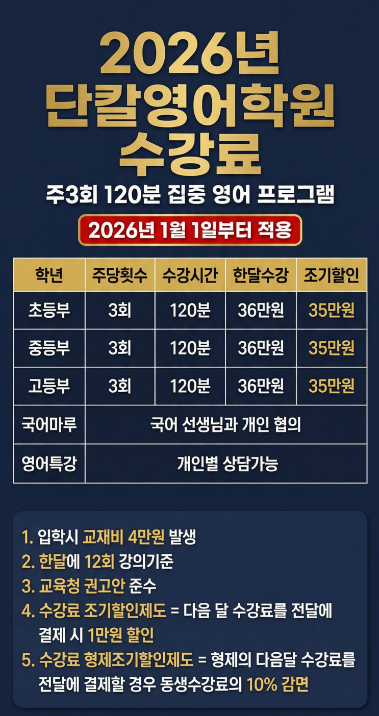 안녕하세요! 소하동에서 영어를 제일 잘 가르치는 영어학원, 소하동 단칼영어학원입니다! 3월 신학기가 시작되면서 설레는 마음으로 등교할 우리 단칼학생들! 후회없는 1년을 위해 열심히 영어 공부할 수 있도록, 단칼영어학원에서 집중 영어 프로그램을 준비했어요! 2026년 단칼영어학원 주3회 / 120분 집중 영어 프로그램 입학시 교재비 4만원 발생 한 달에 12회 강의 기준 교육청 권고안 준수 수강료 조기 할인 제도: 다음 달 수강료를 전 달에 결제 시, 1만원 할인 수강료 형제 조기 할인 제도: 형제의 다음 달 수강료를 전 달에 결제할 경우, 동생 수강료의 10% 감면 초등부부터 고등부까지, 주3회 120분 수업으로 영어에 대한 자신감을 레....... <img src="https://blogthumb.pstatic.net/MjAyNjAzMTZfMTE4/MDAxNzczNTkwMTU4NTM1._w262R-79Qvijy_GTnAFkAFk30jML_k6-_QvMWuhj2kg.Gn7cZbbUE_nhWD92OjvwP9UybcXiMq_AAtSzvVoD_nsg.PNG/KakaoTalk_20260316_004323053.png?type=s3" />
