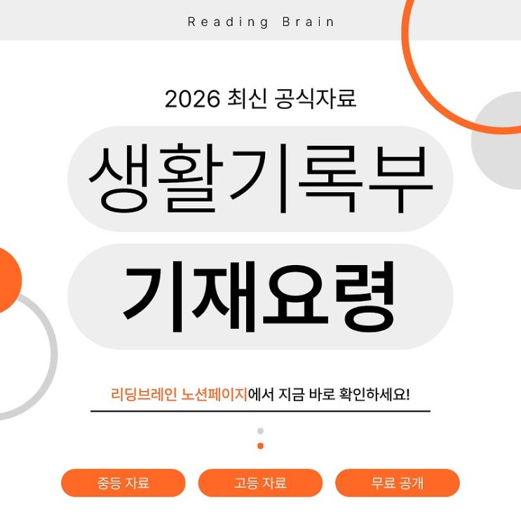 안녕하세요 영어를 넘어 세상을 읽는 힘, 광명 일타영어학원 리딩브레인 영어학원입니다 :) 학년이 올라갈수록 생기부 한 줄 한 줄의 무게가 달라진다는 걸 체감하시는 부모님들을 위해 이번에 리딩브레인이 2026년 최신 생활기록부 기재요령 핵심 자료를 정리해 공유드립니다. ✔️ 생활기록부, 왜 꼼꼼히 봐야 할까요? 생활기록부는 옛날의 성적표와 다른 개념입니다. 수시 전형에서는 내신 성적만큼이나 생기부 전체의 흐름과 일관성이 중요하게 평가됩니다. 대학 입학처에서는 생기부를 통해 학생이 3년간 어떤 관심사를 갖고, 어떻게 성장해 왔는지를 읽어냅니다. 따라서 기재 내용이 얼마나 구체적이고 유기적으로 연결되어 있느냐가 실질....... <img src="https://blogthumb.pstatic.net/MjAyNjAzMThfNjcg/MDAxNzczODIzNDAzMDky.WYD6IsUa5eWpPA_5ioO23WNJcHChNcstxUZsoZnehscg.WxkKqwxlQuFO5q8dnRFTZqKY3qRCz-eaFAFQlTbUA-cg.JPEG/%BB%FD%B1%E2%BA%CE_%B1%E2%C0%E7%BF%E4%B7%C9.jpg?type=s3" />