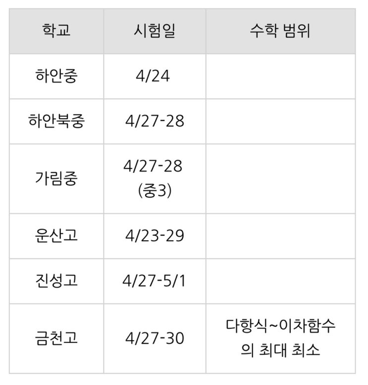 안녕하세요 광명시 수학학원 봉수학 입니다. 봉수학 친구들 시험 일정과 범위 안내드립니다. (자세한 내용 나오는 대로 수정하도록 하겠습니다) 시험 대비 보강은 4월 매주 일요일 1시-4시까지입니다! 감사합니다 :) <img src="https://blogthumb.pstatic.net/MjAyNjAzMThfNyAg/MDAxNzczODI0NzcxNTg1.XuiaIPdMKHh-wxNBYDhShLZYd6AJ1FTZPBICyvrPvvog.I-b4k8_usx81mSQp4uHPpLLZwuJWyvA9-q-R_RweW-Mg.JPEG/IMG%A3%DF0206.jpg?type=s3" />