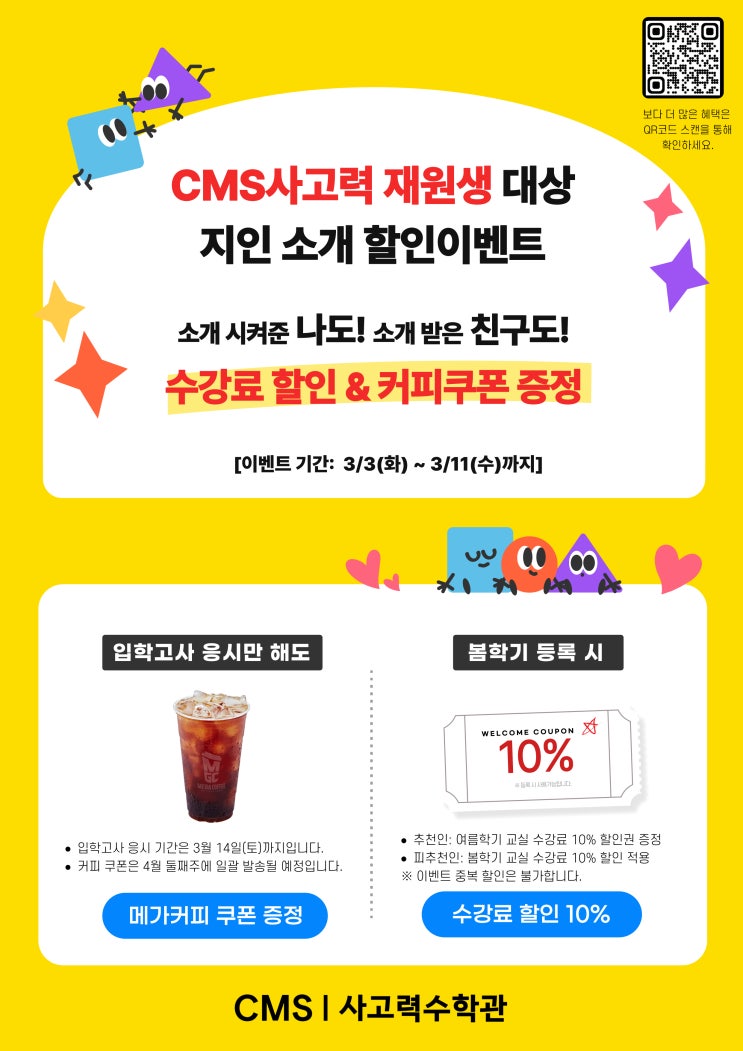 [산본CMS사고력관] 나도 받고, 친구도 받는 '지인 소개 할인 이벤트' 안내! 안녕하세요! 산본 CMS 사고력관입니다. 새 학기를 맞아, CMS사고력관을 믿고 보내주시는 학부모님들께 감사한 마음을 담아 지인 소개 이벤트를 준비했습니다. 소개해 준 나도! 소개받은 친구도! 모두 혜택을 누릴 수 있는 지인 소개 할인 이벤트! 지금 바로 확인해 보세요. ️ 이벤트 기간 2026년 3월 3일(화) ~ 3월 11일(수)까지 (단 9일간 진행되니 기간을 꼭 확인해 주세요!) 풍성한 혜택 안내 이번 이벤트는 두 가지 단계로 혜택을 드립니다! 1. 입학고사 응시만 해도? * 혜택 * 메가커피 쿠폰 증정 ☕ (쿠폰 발송 - 4월 둘째 주 일괄....... <img src="https://blogthumb.pstatic.net/MjAyNjAyMjhfMTk2/MDAxNzcyMjUwODEwNDk5.RQZWHxZNjwMDqcgrtynUmHoXFmEseQ-7ru6D2NlYrrog.JA5zW33r4pEm87bWA2ryUiEPD9y0E9bkL234FEgBQZMg.JPEG/%28%BC%BE%C5%CD%BF%EB%29MT_26%BA%BD_%C1%F6%C0%CE%C3%DF%C3%B5_%C0%CC%BA%A5%C6%AE_%BE%C8%B3%BB%B9%AE_1.jpg?type=s3" />