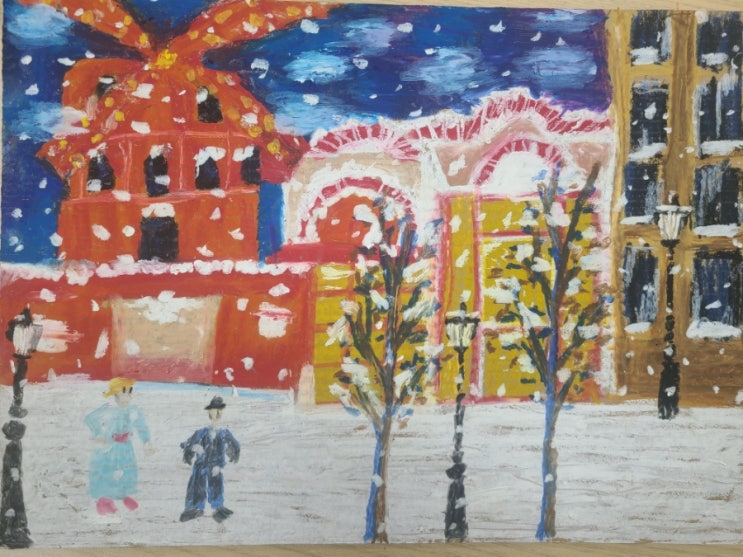 프랑스의 화가 미쉘 들라크루아는 파리의 아름다운 옛 풍경을 따뜻하고 정감 있게 그리는 것으로 유명합니다. 특히 그의 '겨울 풍경'은 펑펑 내리는 눈과 집마다 켜진 불빛을 통해 추운 겨울 속에서도 포근한 정서를 전달하죠. 아이들은 작가의 작품을 감상하며 "눈이 오는데 왜 따뜻해 보일까?" 라는 질문으로 수업을 시작했습니다^^ "박스지의 재발견과 나이브 아트의 이해" 매끄러운 도화지가 아닌 박스지를 캔버스로 선택했습니다. 박스지의 요철은 건물의 벽면이나 눈 쌓인 거리의 느낌을 자연스럽게 살려줍니다. 나이브아트는 정식 미술 교육을 받지 않은 작가들이 전통적인 화법에 얽매이지 않고, 자신만의....... <img src="https://blogthumb.pstatic.net/MjAyNjAzMTNfMjU5/MDAxNzczMzczOTQwMDc0.VJdPYS0JPYuMXZ7xGK8D_p3nqsY93AzD8JUMZhCXvMMg.V6U5bTv_uD8HGlQuLk7-m2vM8w76HXOkuaG4Mv6pWk4g.JPEG/900%A3%DF1773373939481.jpg?type=s3" />