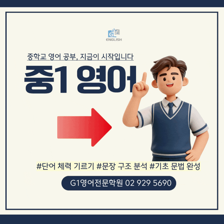 성북구 G1영어학원 중1영어 공부법 중1은 영어가 ‘감’에서 '실력’으로 바뀌는 시기입니다 요즘 상담을 하다 보면 “초등 학원에서는 계속 잘한다고만 하셔서요… 이렇게 구멍이 많은 줄 몰랐어요.” 이런 말씀을 하시는 경우가 많습니다 초등 위주 학원에서는 숙제 잘 하고, 태도 좋고, 시험 몇 개 맞으면 "잘한다"라는 말을 듣습니다. 하지만 중등, 고등까지 보는 기준에서는 다릅니다 중학교 1학년은 영어를 처음으로 제대로 공부하기 시작하는 시기입니다 막상 중등 수업을 시작해 보면 단어가 안 되어 있고 문장 구조는 모른 채 독해는 감으로 풀고 문법은 용어만 들어 본 적이 있고 개념 자체는 엉망진창인 경우가 대부분....... <img src="https://blogthumb.pstatic.net/MjAyNjAzMDVfMjIx/MDAxNzcyNzEwNTQwNDg3.O_H2JlPtjjz9FzEjlc4gDWD-LoHU0POm27OnUlGkk8cg.ogXIspEO2va6yulPWFnQW4Z73WGJwSq_9YTNGDYd5hwg.GIF/g1%BF%B5%BE%EE2.gif?type=s3" />