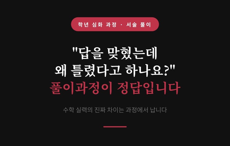 아이 수학 노트를 펼쳤을 때, 순간 화가 나셨던 적 있으신가요? 숫자는 알아보기 힘들게 흘려 쓰여 있고, 세로식이 여기저기 흩으져 있고, 왜 그 답이 나왔는지 도무지 알 수 없는 풀이들. 맞긴 맞았는데 뭘 알고 맞은 건지 도저히 모르겠는 그 느낌 - 학부모님이라면 한 번쯤 겪어보셨을 겁니다. 그 답답함, 저희도 정확히 같은 마음입니다. 수학 실력은 답안지 위 숫자 하나에 있는 게 아니라, 그 숫자에 도달하기까지의 생각의 흐름에 있으니까요. 수학에서 풀이과정은 사고의 기록입니다. 아이가 어떻게 생각하고, 어디서 막혔는지, 무엇을 이해했는지- 모든 과정 속에 담겨 있습니다. 저희가 풀이과정을 그토록 강조하는 이유가 바로 여기 있....... <img src="https://blogthumb.pstatic.net/MjAyNjAzMDVfMjg0/MDAxNzcyNzExODM1MzMx.luugx9iIZmPWmJWaAjBj55Eljpb1K4AlXfF_fwMmJFcg.XeI4agTAB4FVM4frLMFyqx7q2Vi48KLYXcwTft27P-Mg.JPEG/1-1.jpg?type=s3" />