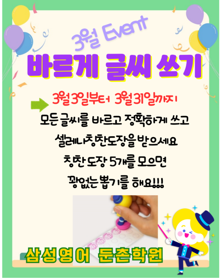 안녕하세요, 3월 학원소식지와 교육계 동향입니다! 안녕하세요. 삼성영어셀레나 둔촌학원입니다. 새 학년, 새 학기가 시작되는 3월입니다. 아니 벌써!!! 3.1절로 시작하는 한 해중 가장 설레는 달입니다. 대한독립을 외치는 함성은 봄을 기다리는 모두의 외침은 아니었을까요! 우리 친구들 언제나 주변을 돌아보고 배려하고 나 자신에게 최선을 다하세요. 영어는 삼성영어셀레나가 잘 키울게요! 삐약이 신입원생들도 학교 생활 뿐 아니라 학원에도 잘 적응하기 바래요! *설특집 영작문집 칭찬이벤트, 모두가 멋진 자기 칭찬을 하였고 가족들의 응원도 넘쳤던 기쁘고 행복한 행사였어요! 칭찬마다 포인트가 주어졌고 6명의 친구가 아이스크림 쿠폰....... <img src="https://blogthumb.pstatic.net/MjAyNjAzMDJfNTkg/MDAxNzcyNDU1NjUwNzg5.wpYWBuRUWoKDh_O7o5khsRBdXzChkWTgE5RylwuY7FYg.8fbn_OLLZGfOHC3Eo1tFVcD3v_SHDecZpq4BH7uDVscg.PNG/26%3F%85%843%3F%9B%94%3F%9D%B4%EB%B2%A4%ED%8A%B8.png?type=s3" />