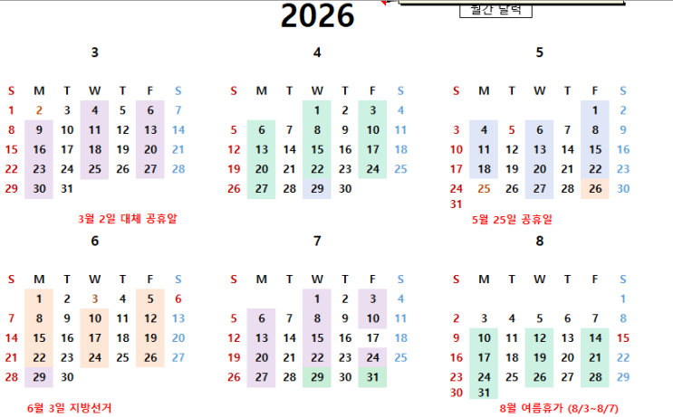 안녕하세요. 피비쌤 영어 입니다. 피비쌤 영어 2026년 상반기 수업일정 안내 드립니다. 수업 일정이나 여름 휴가등은 상황에 따라 변경 될수 있으니 참고 바랍니다. 1. 26년 3월~ 26년 8월 <월수금> 수업 2 26년 3월~ 26년 8월 <월수목> 수업 3. 26년 3월~ 26년 8월 <월목금> 수업 4. 26년 3월~ 26년 8월 <수목금>수업 <img src="https://blogthumb.pstatic.net/MjAyNjAyMTlfMjQw/MDAxNzcxNDY2NTUzMjU4.udJaTxcf130EKCizmu7LWuEFug_lB0JpCrQAiTrs_UYg.1uWjLDvS3WMFDldRmfgcaDpuQLJzYAwZXAr8dhT1OHYg.PNG/image.png?type=s3" />