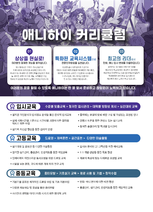 안녕하세요. 대전 하이파이브·애니 하이 미술 학원입니다! 지난 대전 하이파이브 기초디자인 클래스 소개 글에 이어서, 오늘은 애니 하이의 핵심 교육 과정인, 애니메이션 클래스 전반을 소개해 드리려고 합니다! 애니메이션 입시는 단순히 그림 실력만으로 준비하기는 어려움이 있습니다. 상황 연출, 캐릭터 설정, 화면 구성, 컷 전개, 스토리 구조 등 한 컷 한 컷에 복합적인 표현 능력이 요구되기 때문인데요! 애니 하이는 학생들이 상상한 세계를 실현할 수 있도록 창의 기반의 실기교육, 전문화된 수업 시스템, 변화하는 입시 흐름을 읽는 리딩 교육을 중심으로 탄탄한 애니메이션·만화 커리큘럼을 운영하고 있습니다. 중등 → 예비 → 입시....... <img src="https://blogthumb.pstatic.net/MjAyNTEyMTFfMjUx/MDAxNzY1NDQ4OTIzMTE4.sDLaOQphWF_n04b4DqMtSdnZqKJFemwaAmFFzJVt6aAg.har2EJbU3XAe8cJVJV7IqCxRKeMCKH_ka410zu1iWjEg.JPEG/KakaoTalk_20251211_191141701.jpg?type=s3" />