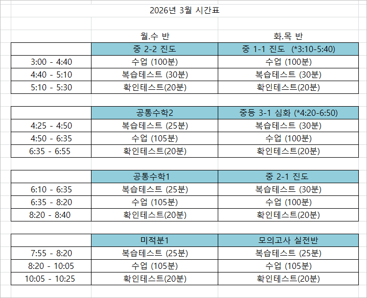 26년 3월 시간표 안내드립니다.
