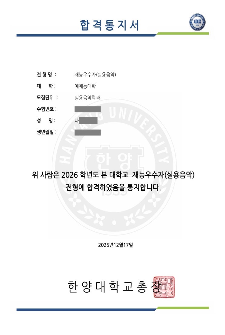 26년도 수시 한양대학교 실용음악학과 최종 합격!