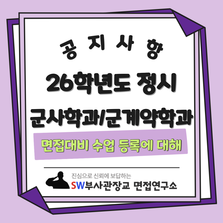 안녕하십니까! SW부사관장교 면접연구소의 커피소장입니다. 이제 곧 26학년도 대입 정시 면접의 시기입니다. 그래서 요즘 관련 문의가 많이 오고 있어요. 물론 전화로 말씀드리는 것도 좋겠지만 이렇게 포스팅을 해놓는 것이 더 좋을 것 같아서 공지사항으로 올립니다! 조금만 블로그를 둘러보셔도 아실 수 있지만 저는 부사관장교학원을 약 8년간 운영했고, 최근 2년 동안은 군 간부 면접을 전문적으로 강의하고 있습니다. 수업 또한 그동안의 강의경험을 토대로 군별, 학교별 경향을 최대한 맞추고 있으며 짧은 시간이라도 최선을 다해 성의있는 강의를 추구하고 있습니다. 26학년도 정시 면접대비수업 원칙은 아래와 같습니다. 1/5 이전 1. 하....... <img src="https://blogthumb.pstatic.net/MjAyNTEyMjFfMiAg/MDAxNzY2MzAzMzcwMzgz.yrkmqAyqnMGGEcS1rwdX2DkfTQJ8r12AHxhtN7VgZl8g.n9ZasuUXDdZCJDlkzGAjPyefMx0-O0uP3RcdzCAnZiog.PNG/%BD%BA%C5%A9%B8%B0%BC%A6_2025-12-21_%BF%C0%C8%C4_4.49.24.png?type=s3" />