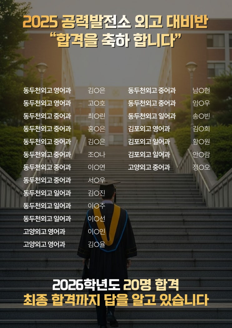 안녕하세요, 외고 입시와 내신 전문 공력발전소학원입니다. 저희는 김포, 일산, 다산에 캠퍼스를 두고 있습니다. 매년 성장하는 학원으로 작년에는 14명의 합격자를 냈지만, 금년에는 20명이 합격했습니다. 전년보다 훨씬 치열해진 입시였다는 것을 감안하면 최고의 성과를 냈다고 자부합니다. 고양외고, 김포외고, 동두천외고 합격을 축하합니다! 고양외고를 끝으로 금년도 외고 입시가 마무리되었습니다. 저희는 금년에도 학생들이 열심히 노력하여 좋은 성과를 거두었습니다. 20명이 합격하는 쾌거를 거두었습니다. 더 열심히 분발하여 외고 입시와 내신에서 최고가는 학원으로, 학생들 중심으로 이끌어 가겠습니다. 감사합니다. 2026년 외고....... <img src="https://blogthumb.pstatic.net/MjAyNTEyMzFfMTQ1/MDAxNzY3MTQ3MDA1Mzc5.LUCJjasJ1vyL6xrIYKpucofDn6iAYkSLtjSWQ-gulnQg.mX_RUtLq8KD-p_qddrLBjsn54YhE8W0BERxpi0fM85cg.JPEG/2025_%BF%DC%B0%ED_%C7%D5%B0%DD-02.jpg?type=s3" />