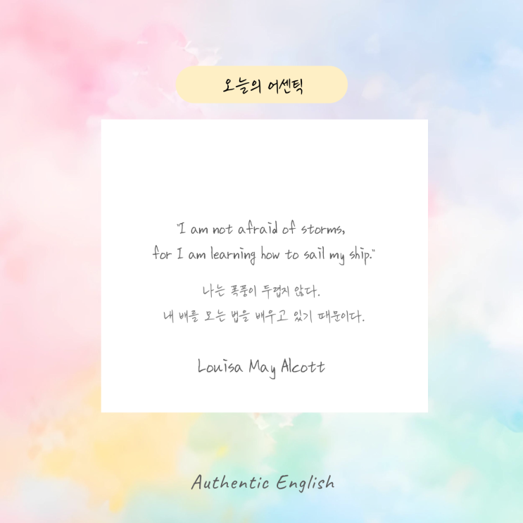 “I am not afraid of storms, for I am learning how to sail my ship.” 나는 폭풍이 두렵지 않다. 내 배를 모는 법을 배우고 있기 때문이다. Louisa May Alcott <img src="https://blogthumb.pstatic.net/MjAyNjAxMjhfMTU0/MDAxNzY5NTk1MDc1MDA4.Q5RqUavqHyc-XBPqUJUXHnF9P22_Nf03duQr6R34AtMg.2Tr8rxMtDhaUlq1RzMwKhudt8P0DulGdxRxC1fa3WCwg.PNG/022.png?type=s3" />