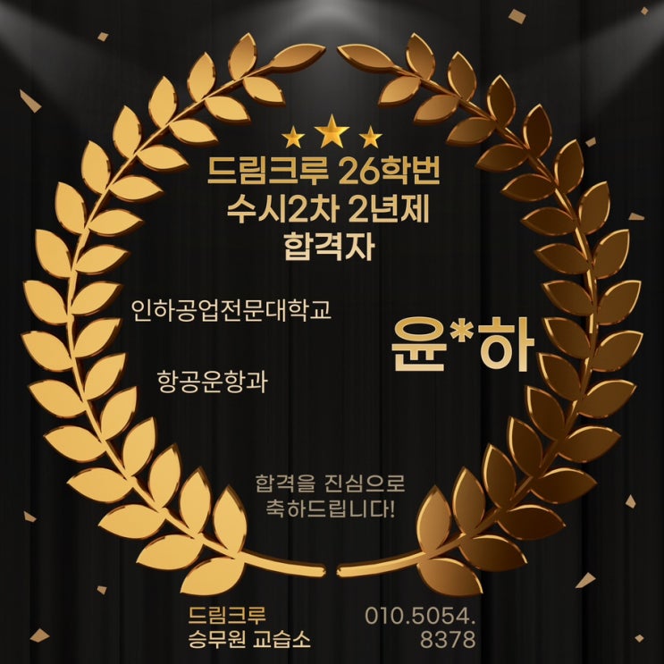 수시 2차 발표가 모두 끝나고 예비합격하는 친구들도 하나둘씩 연락이 오는 시기입니다 어려운 수시2차에 인하공전 항공운항과 학생 합격 소식을 전해드립니다. 합격을 진심으로 축하드립니다^^ 고생했던 노력이 합격으로 보답하네요^^ #이천승무원학원#소수정예의힘#항공과합격#인하공전항공운항과합격#항공과면접#양정여고#이천고#이현고#다산고#여주제일고#이천제일고#실전면접#한서대출신원장 <img src="https://blogthumb.pstatic.net/MjAyNTEyMTlfMTMg/MDAxNzY2MTI2MTE5MDUx.UMPb5JXhX0CYyg1HHZCiBxDJDFnZAS8wV-zL6mk63ncg.KX0SvLLkH7kYZYJPQpAwpkwyeSEkpJq4a-diY1wP7ZIg.JPEG/IMG%A3%DF0167.JPG?type=s3" />