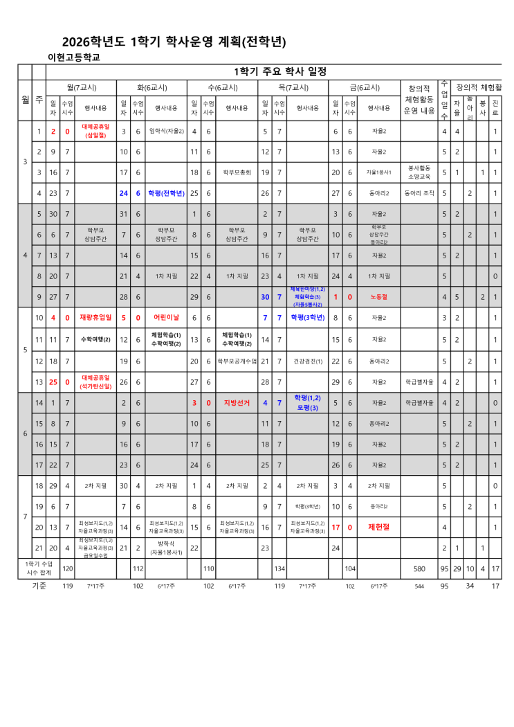 [이현고] 2026학년도 이현고등학교 학사일정