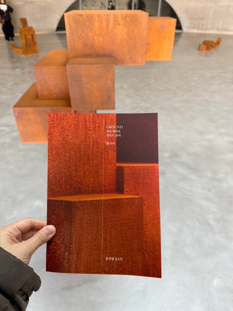 뮤지엄산- 안토니곰리관 오픈 (안도타다오x안토니곰리) 침묵과 명상의 공간 ‘안토니곰리관’ 뮤지엄산에 새로운 ground관이 오픈했다고해서 다녀왔습니다. 제주도 본태미술관에가서도 안도타다오의 건축물을 보고 사유하듯이 걸으며 작품을 관람했을때 기억이 너무 좋아서 기대하며 방문했습니다 안도타다오의 건축철학은, 종종 고요하고 긴장감이 있습니다. • 불필요한 요소 제거 • 감정을 자극하기보다 가라앉힘 • ‘내면으로 향하게 하는 건축’ 그래서 종교 건축, 미술관, 명상 공간과 잘 어울립니다. 뮤지엄산의 야외조각품 들을 보고나면 이렇게 그라운드관이 둥근 돔 형태로 있는것을 보실수있습니다. 안에서 본 그라운드 곰리관 그라....... <img src="https://blogthumb.pstatic.net/MjAyNjAyMTlfMjEz/MDAxNzcxNDg0NzQ1NzQ2.mhRG4Xe36xJidjn_ZfZ1eHsrdPk9HPVsSaNK_xamsp0g._EX9oMxO3j_j1RNRqw7j4nTHFLE359hX12BzT6xqiNEg.JPEG/IMG%A3%DF0227.jpg?type=s3" />
