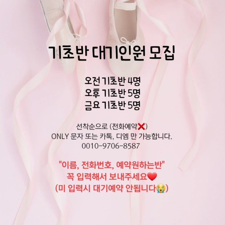 기초반 대기 인원 오픈 선착순 마감이라 매번 빠르게 마감됩니다. 스피드가 생명!! 이번 기회 놓치면 다음 대기까지 기다리셔야 해요! 문자·카톡·DM 접수만 가능 ⛔전화 불가⛔ 자리 남아있을 때 바로 문의 주세요 010-9706-8587 #구미성인발레 #구미발레 #구미초등발레 <img src="https://blogthumb.pstatic.net/MjAyNjAxMzBfMjQ3/MDAxNzY5NzYzNDgzNTY5.0gRUw8gtzHfqggj1OP1JeS2MY732PS_P70q566BL4UYg.n49WZcZgRfGGNtUIC0XOkSBMZbVxMwKejO9BoJ-oyYMg.JPEG/900%A3%DF1769754281962.jpg?type=s3" />