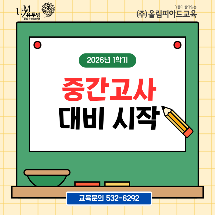 안녕하세요. 방배동에서 초등·중등 수학을 지도하고 있는 유투엠 서초방배캠퍼스입니다. 3월이 되면 많은 학부모님들께서 이런 질문을 많이 하십니다. “중간고사 준비는 언제부터 해야 할까요?” 보통 중학교 1학기 중간고사는 빠르면 4월 22일부터 시작됩니다. 지금이 3월 중순이니 실제로 시험까지 남은 시간은 약 5주 정도입니다. 그래서 중등 수학 시험 대비는 대부분 지금 시점부터 시작하는 것이 가장 안정적입니다. 중등 수학 시험 초등과 공부 방식이 다릅니다 초등 수학은 시험 직전에 문제를 많이 풀어도 어느 정도 점수가 나오는 경우가 있습니다. 하지만 중등 수학은 구조가 다릅니다. 특히 1학기 시험 범위는 보통 ✅ 식의 계산 ✅....... <img src="https://blogthumb.pstatic.net/MjAyNjAzMTRfMjgw/MDAxNzczNDUxMzYzOTY3.qqrjV9w0WLLICA25FzgsbwJKtSIduSzoSDTB4GVCTYQg.xRntM8Wf16snVXHlFhhJD3AwHDpCOStuwzAgJhrQEb8g.PNG/1%C7%D0%B1%E2_%C1%DF%B0%A3_%BC%F6%C7%D0_%BD%E6%B3%D7%C0%CF.png?type=s3" />