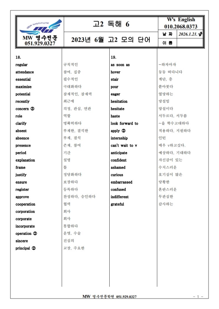 부산 동래구 명륜동 영어 엠더블유MW영수전문학원입니다. 2026년 1월 예비고2 학생들을 위한 2023년 6월 고2 전국연합 학력평가 모의고사 필수단어입니다. 고2 학생들도 이제 2022년 개정 영어교과서 영어1 출판사가 어느정도 결정되고 있습니다. 학교 홈페이지에 등록되어있지만, 몇몇 학교들은 출판사가 바뀌는 경우도 있어서 확인하는데 시간이 조금 더 필요할 것 같습니다. 3월 내신대비에 앞서 중요문법을 대비하고 있지만, 각 학교별, 출판사별 중요 문법 위주로 타겟팅하기위해 출판사별로 영어1 교과서의 문법을 정리했고, 학생들 단톡방에는 공지로 알렸습니다. 단어와 필요한 문법이 준비되어있으면, 내신대비 속도는 훨씬 빠를 것이라....... <img src="https://blogthumb.pstatic.net/MjAyNjAxMjZfMjQy/MDAxNzY5MzU1MTMyMTgx.UoC8FoaC0dVFvpcYKaaty1fBJDhhn1EqJzgNhmrniIkg.mAskN57rP4FDDMk8weJDPlGoUy-IqDVxstHzhMv4W4Qg.JPEG/%B5%B6%C7%D86_2023%B3%E2_6%BF%F9_%B0%ED2_%B8%F0%C0%C7%B4%DC%BE%EE_1845_1.jpg?type=s3" />
