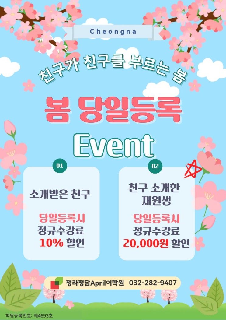 봄학기 당일등록 이벤트 봄은 시작의 계절, 그리고 함께하면 더 쉬운 계절 이번 봄엔 친구와 함께 영어도 한 단계 업! 소개받은 친구: 당일등록시 정규수강료 10% 할인 소개한 재원생: 친구 당일등록 시 정규수강료 20,000원 할인 기간: 2월말까지 진행 청라청담April어학원 : 032-282-9407 <img src="https://blogthumb.pstatic.net/MjAyNjAyMTlfMjgy/MDAxNzcxNTAxMjA1Njg0.09ExlFsXTCrqnJNPf3rgokdBp3myT3J1qLGz2hj8sVUg.2VHlSpyD8Ug0eZgfYT1gyScX63kRJxGJ0Njt4ejNdUwg.JPEG/%BA%BD%C7%D0%B1%E2_%B5%EE%B7%CF_%C0%CC%BA%A5%C6%AE-%BA%B9%BB%E7%BA%BB-_%BA%B9%BB%E7%BA%BB_%281%29.jpg?type=s3" />