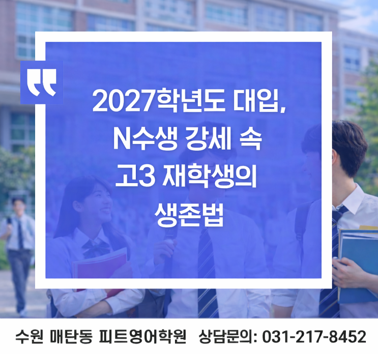 안녕하세요 문법부터 스피킹까지 꼭 맞게 FIT 해주는 망포 매탄동 피트영어학원 입니다 :) 2027학년도 대입을 치를 현재 고3 학생들에게 올해 입시 환경은 결코 만만치 않은 상황입니다. 현행 수능 체제에서 선택과목이 존재하는 마지막 수능인데다가 작년 불수능의 여파로 재도전을 선택한 N수생들이 많이 유입될 것으로 보이기 때문입니다. 여기에 지역의사제 중심의 의대 증원 소식까지 더해지면서 최상위권 대학생들까지 반수 대열에 합류하고 있다는 얘기가 들려오고 있답니다. 이런 변화의 시기에 고3 재학생들이 합격을 위해 꼭 기억해야 할 핵심 전략을 살펴봅니다. 고3 1학기 내신, 합격을 가르는 마지막 기회 고3 1학기 내신은 수시 지....... <img src="https://blogthumb.pstatic.net/MjAyNjAyMjZfMTQ1/MDAxNzcyMTAyNzY3ODE5.aK7BUPmtwwoo-C1raZgyEHIVoBNcGGl7YgXl_vzsoM4g.OLE5kT_qiRQXrxLh9f0WdV-NiZEAHSEl3m2__RXZ8iAg.PNG/KakaoTalk_20260226_194406840.png?type=s3" />