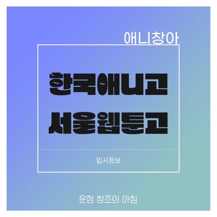 안녕하세요! 운정 창조의 아침입니다. 2026년 2월은 모든 입시 일정이 끝나고 새로운 입시가 시작되는 첫 달입니다. 오늘은 요즘 운정 이마트 앞 미술학원 운정 창조의 아침에 문의가 많은 "애니고"입시에 대한 포스팅입니다. 애니고는 -한국 애니메이션 고등학교 -서울 웹툰 애니메이션 고등학교 -경기예술고등학교 이렇게 3곳을 많이 희망하고, 지원합니다. 오늘은 한국 애니고와 서울 웹툰이고 입시전형을 살펴보도록 하겠습니다. 한국 애니메이션 고등학교 = 한국 애니고 한국 애니고는 경기도 하남시에 위치하고 있습니다. 모집인원은 과별로 24명 정원이지만 전형별로 상이합니다. -만화창작과 -애니메이션과 -영상 연출과....... <img src="https://blogthumb.pstatic.net/MjAyNjAyMjZfMzQg/MDAxNzcyMDkyODE5NDM2.ltY0Z56cYrv3WVw52ksFiEqpgvL-SvvaGNOAUZf4Ej4g.QMfvoVkX-wZCRdDosTefrF8-ssP_oslIVzqaz84jyrkg.JPEG/1.jpg?type=s3" />
