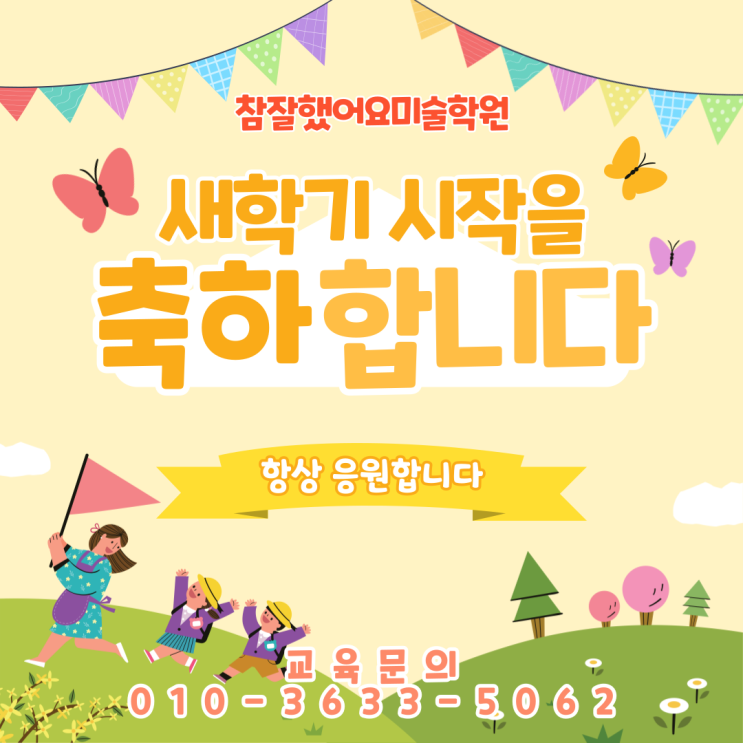 새학기 시작을 축하합니다! 알록달록 가랜드처럼 설레는 마음을 가득 담아 우리 아이들의 새학기를 진심으로 응원합니다. 새 가방을 메고, 새로운 친구를 만나고, 한 뼘 더 자란 마음으로 시작하는 소중한 시간✨ 미술은 단순히 그림을 그리는 시간이 아니라 아이들의 생각을 펼치고, 자신감을 키우고, “나도 할 수 있다!”는 성취감을 배우는 과정입니다. 참잘했어요미술학원은 아이 한 명, 한 명의 개성과 속도를 존중하며 따뜻하게 성장하는 공간이 되겠습니다. 상상은 자유롭게 표현은 즐겁게 성장은 단단하게 새학기, 우리 아이들의 반짝이는 하루하루를 함께 만들어가겠습니다. 상담&예약문의 010-3633....... <img src="https://blogthumb.pstatic.net/MjAyNjAyMjZfNTUg/MDAxNzcyMDc0NTY0MDQ3.WowIeZK2Fb3-_4pNtSjmebl6ZYS5nMvIJ0gWYFefEocg.Tw6Jh7J7uwoqw1qpEJWa0HUzxs0KLkOM47EFxuzfMbgg.PNG/%C1%A6%B8%F1%C0%BB-%C0%D4%B7%C2%C7%D8%C1%D6%BC%BC%BF%E4_-001_%2849%29.png?type=s3" />