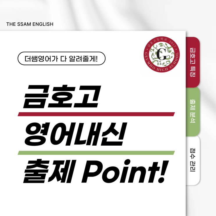 안녕하세요, 더쌤영어입니다 이번에는 금호고 영어 내신에 대해 이야기해 보려고 합니다. 시험을 준비하다 보면 “어디에 집중해야 할지” 헷갈릴 때가 많죠. 금호고 영어는 어떤 부분이 중요한지 함께 정리해 보겠습니다. 금호고 특징 금호 고등학교는 서울 성동구 금호동에 위치한 일반계 고등학교입니다. 4년제 대학 진학 비율은 약 35% 내외이며, 전문대 진학 비율도 비슷한 수준을 보이고 있습니다. 내신은 시험 난이도보다는 얼마나 정확하게 준비했는지가 등급을 좌우하는 구조입니다. 특히 영어 과목의 경우, 큰 변형보다는 기본을 얼마나 정확히 준비했는지를 확인하는 시험 구조를 보입니다. 출제 성향 / 시험 구조 금호고 영어는....... <img src="https://blogthumb.pstatic.net/MjAyNjAyMjFfMjkz/MDAxNzcxNjUzNzc1OTY3.mTaTgSLtjWMgI-bjFlMQ-z1lcz61dy6KhMJYG13oKzEg.8agHDxBgYZbY9PV1enMLKfJKKyLHrSy1I1W6u_MNY-sg.PNG/%C1%A6%B8%F1%C0%BB_%C0%D4%B7%C2%C7%D8%C1%D6%BC%BC%BF%E4._%2830%29.png?type=s3" />