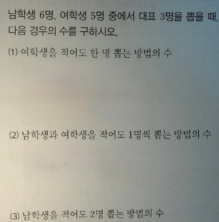 안녕하세요~ 단구동 수학학원 스마트 해법수학 남원주점 산수아저씨입니다~ ^^ 얼마 전 원주에는 함박눈이 펑펑 내렸어요~ 올겨울 마지막 눈이겠지요~ ^^ 일교차가 크긴 하지만, 날이 많이 풀린 듯합니다. 2월 마무리 잘 하시고~ 3월을 두 팔 벌려 맞이해 보아요~ 오늘 풀어 볼 문제는 고1 경우의 수. 어떻게 풀까? 적어도 문제는 ① 전체에서 그 사건이 일어나지 않는 경우의 수를 뺀다. ② 글로 한번 적어보면 이해하기가 좀 더 쉬워진다. 잘 보셨는지요~ 어렵다 생각하지 마시고 차분히 정리해서 풀어 보시면 좋겠습니다~ ^^ 이번 주가 마지막인 라스트 중3 친구의 문제였어요~ (수학 평균 99.5 아쉽게도 성적표가 없어요~ ^^;; 온 집안을 뒤....... <img src="https://blogthumb.pstatic.net/MjAyNjAyMjZfMjI1/MDAxNzcyMDY3MTgyNjg1.JnAhDuBWhp9fUsJtU3WxVBC4zNuagfx4y7I5R9kF40og.KFm5KgQXFzqVKDspAaX-lE-CnFVy4yvKwx5RH0FVy7Yg.JPEG/KakaoTalk_20260226_092946282_04.jpg?type=s3" />