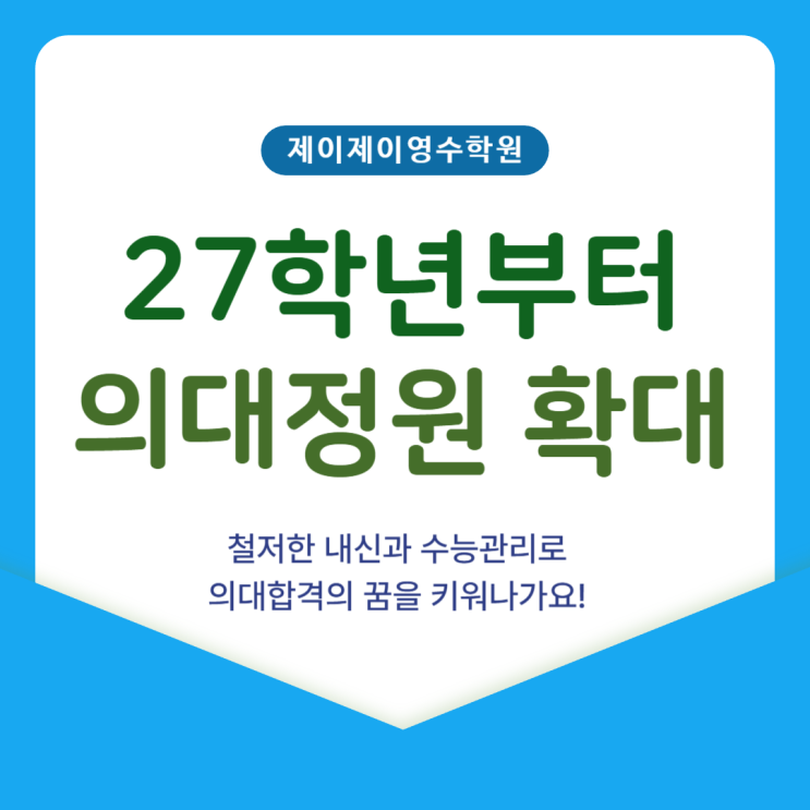 추운 겨울이 물러가고 새 학기가 시작되는 2월 중순, 명절이 지나면 바로 신학기 준비를 해야 하기 때문에 이시기에 부모님들의 마음도 분주해지는 시기입니다. 안녕하세요, 제이제이영수학원입니다. 지난 2월 10일에 정부가 공개한 의과대학 입학 정원 증가 정책이 수험생과 학부모님들 사이에서 뜨거운 반응을 얻고 있습니다. 2027학년도를 기점으로 단계적으로 추진될 이번 조치는 의학계 진학을 목표로 하는 학생들에게 기회를 확대하는 동시에 보다 세밀한 준비를 요구하는 중요한 변화입니다. 오늘은 의대 증원의 핵심 내용과 이를 바탕으로 한 실전 입시 대비 방법을 구체적으로 안내드립니다. 정부는 2027학년도부터 2031학년도까지 매년....... <img src="https://blogthumb.pstatic.net/MjAyNjAyMThfMTIg/MDAxNzcxMzkzMjMxMDQ1.ZEBWWnSKe2f6Adk7XeJWRY6jJdqym-XVTEWmFsWJv2Qg.rcyl1dsmRYaRRboHYrt9D8eyVgTAE8jSaBuqNzyUzLUg.PNG/27%C7%D0%B3%E2%C0%C7%B4%EB%C1%A4%BF%F8%C8%AE%B4%EB-002_%287%29.png?type=s3" />