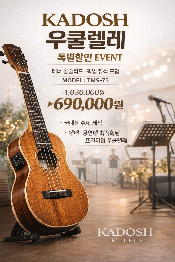 카도쉬 우쿨렐레 올솔리드 테너 특별할인 ▪︎2026.2/10~2/14(토)(5일간) ▪︎국내산 올솔리드 테너 수제품 ▪︎올솔리드(마호가니)프리미엄 테너 -피쉬맨픽업장착 -슈페라라이트테너케이스 -튜닝기, 가본스트랩, 택배포함 ▪︎소비자가 103만원 >>> 특별할인 69만원 ✨️구입문의 : 원장 010-7657-9000 <img src="https://blogthumb.pstatic.net/MjAyNjAyMTBfNjIg/MDAxNzcwNzAyNDUzMDI5.qCW5ViCrYsaas2Wd9qVnKluWm49qgcTk3xbpTH4TAYUg.EbCYjHDoXl7cVqnVCfrKShZEiZdVADJqcEyk-ewx08Ag.PNG/900%A3%DF1770697884658.png?type=s3" />