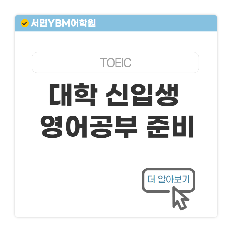 안녕하세요. YBM서면입니다 :) 대학 새내기라면 누구나 공감할 고민, 바로 영어공부 입니다. 대학 가기전에 영어공부를 좀 많이 해놔야 된다던지, 다들 토익 준비한다던데 안하면 나만 뒤처지는게 아닌지 특히 대학 신입생 시기에는 막연한 불안이 가장 큰데요. 아직 시작하지도 않았는데 벌써부터 취업 이야기가 들리고 그 중심에는 항상 TOEIC 이 있죠 .. ㅎㅎㅎ 그렇다면 정말로 개강 전부터 토익을 시작하는게 유리할까요? 정답부터 말하면 무조건 빨리 시작한다고 유리한건 아니고, 전략적으로 시작하는것이 유리하답니다 :) 단순 무작정 시작이 아니라, 1학년 생활과 균형을 맞추면서 효율적으로 점수 올리는 방법을 알려드릴게요 :) 1️⃣....... <img src="https://blogthumb.pstatic.net/MjAyNjAyMjNfMTI5/MDAxNzcxODIyNzYyNTQ2.P336rYw-5l-8B4PgcjngkNhWJf9JJzfK6eSPJgmWU24g.diZ4fsLwL5OKtzljFabzL-ynMMIznM8AatA80CZZMR4g.PNG/%BA%ED%B7%CE%B1%D7_%B4%EB%C7%A5%BB%E7%C1%F8%BF%EB.png?type=s3" />