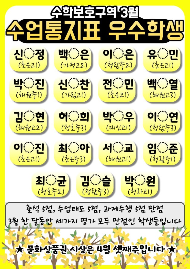 [청라수학학원 수학보호구역] 3월 수업통지표 우수학생