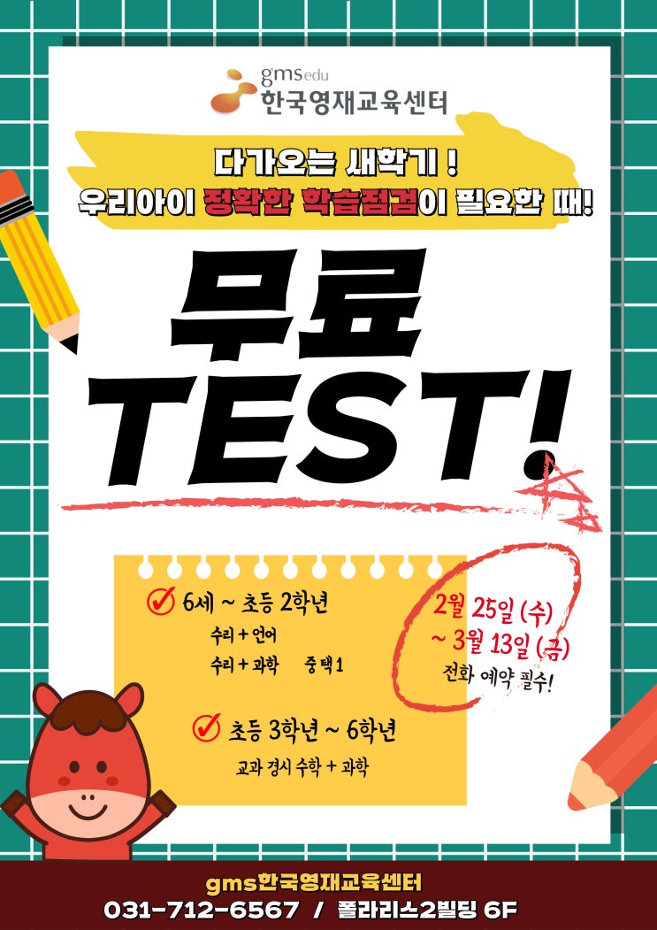 2026 gmsedu 새학기 무료 레벨테스트 EVENT! 안녕하세요. gmsedu 입니다. 겨울방학이 마무리 되어 가면서 많은 어머님들께서는 새 학기 준비에 바쁘시죠? gmsedu에서는학부모님들의 성원에 힘입어 2026년 gmsedu 새 학기 무료레벨테스트 EVENT! 를 실시하게 되었습니다. 6세~ 초6까지 event 과목이 다르니, 확인해주세요^^ 무료 레벨테스트는 2026년 2월25일(수) ~ 3월13일(금)까지 진행되며 사전 예약시 시험 응시가 가능하니 꼭 센터로 전화하셔서 예약일정을 확인해 주세요. ※ 당일 상담은 어려울 수 있으며, 상담일정은 테스트 당일 학부모님과 상의 후 결정합니다. 저희센터에서 고집하는 특징 중 하나는 상담실장이 아닌 수업을 직접 담당....... <img src="https://blogthumb.pstatic.net/MjAyNjAyMTlfMTY2/MDAxNzcxNDk1Njg4OTI4.CCA0MlRRJqYLMnBBxlqXXlzq__rgYbXBjLe7RzQ4zrYg.zVIywyDtMNZWdKWwbJExcckag_hkwowjNJr9O6XVkg0g.JPEG/2026_%B9%AB%B7%E1%C5%D7%BD%BA%C6%AE.jpg?type=s3" />