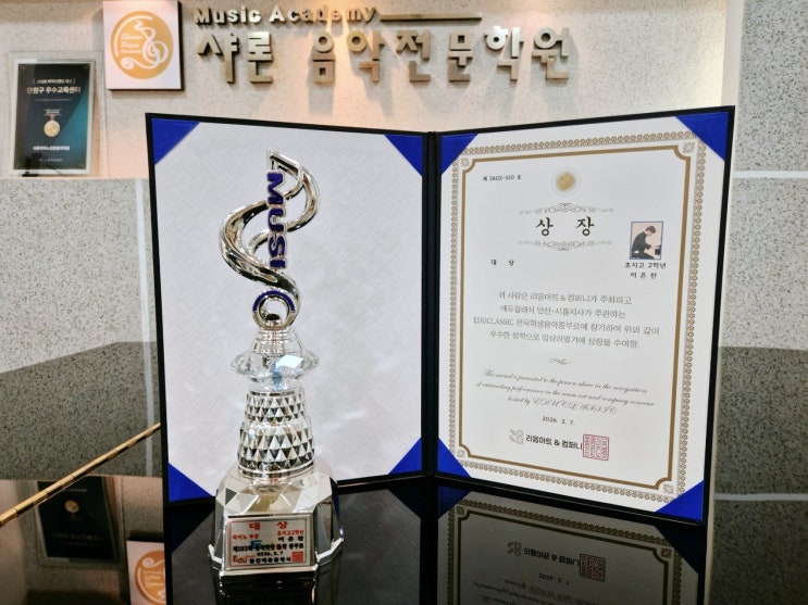 2026년2월7일 에듀코리아클래식전국콩쿨 피아노부문 대상!!^^ 항상그래왔듯이 우리샤론에서 또,역시나 대상을 가져왔네요♡ 참가에 의의 두는것도 중요하지만, 동등한 연주 조건에서 성적이 나뉘는 콩쿨 순위 역시 중요하죠!!^^ 5학년에 샤론와서 고칠것도 많고 다시 시작해야할것도 많아서.. 쌤 고생 많이 시켰지만;;;; 이제는 여러모로 성장해서 연주자를 꿈꾸는 은찬아~^^ 곧,대학교 입시네~ 남은시간도 잘~만들어가보자!! 안산시 초지동그린빌11단지상가2층 상담: 031 475 7931 기초, 취미, 콩쿨 ,예중,예고, 대학입시... 전문피아노학원입니다!^^ <img src="https://blogthumb.pstatic.net/MjAyNjAyMjRfMTc1/MDAxNzcxOTA1ODU4MDYw.1hmo6PHEDZCYfz8BUHiAHUl20Itm-j2wlu7Cj4rqbN8g.viainVJiREgiNuelkRqlS7NRYe-vJq3lmGauG6BfkAog.JPEG/download.api.jpg?type=s3" />