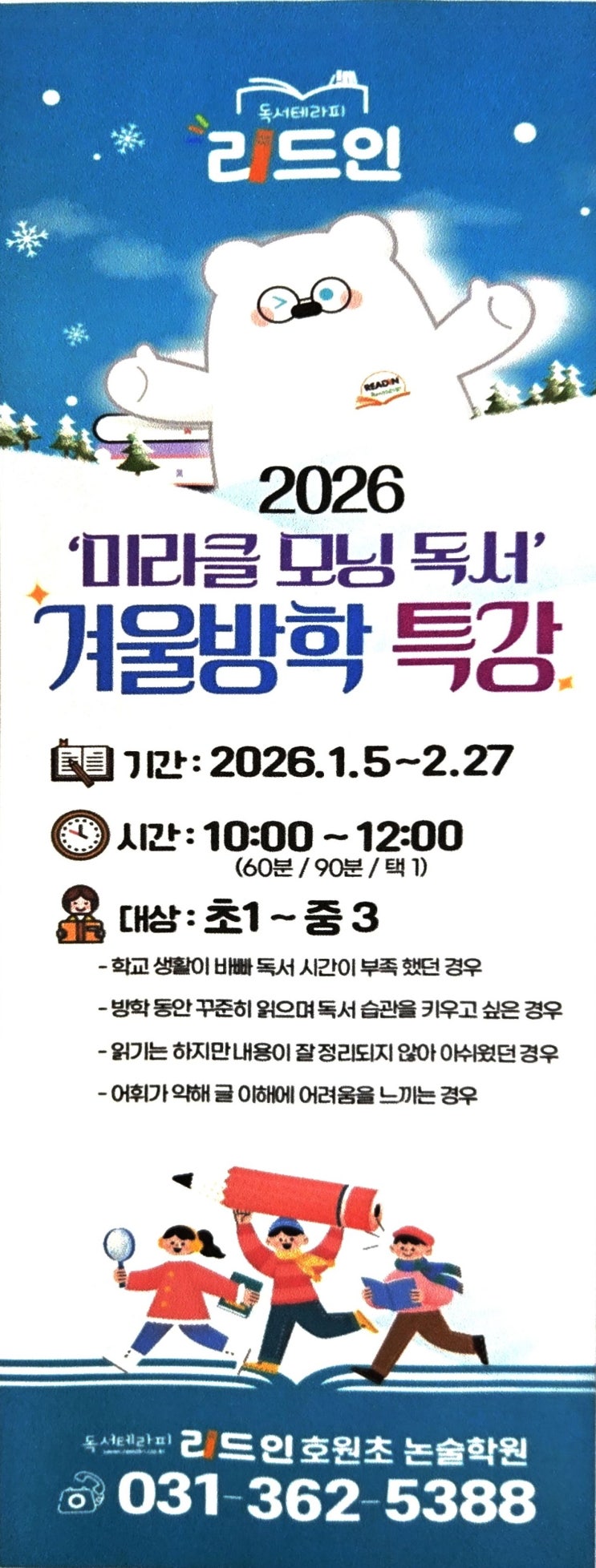 리드인 겨울방학 몰입독서 특강 안내 이번 겨울, 우리 아이에게 ‘읽기 체력’과 ‘독해력의 기초’를 완성하는 시간을 선물하세요. 요즘 학부모님들께서 가장 많이 물어보시는 질문 중 하나는 “겨울방학에 아이에게 어떤 공부를 하면 가장 효과적일까요?”입니다. 그 해답은 바로 몰입 독서입니다. 몰입독서는 단순히 책을 많이 읽는 것에서 끝나지 않습니다. 책을 깊이 있게 읽고 → 생각하고 → 자신의 언어로 정리하며, 아이의 독해력·사고력·표현력을 한 번에 성장시키는 리드인의 핵심 학습이에요. 방학 동안 아이의 문해력을 확실히 잡고 싶다면, 이보다 더 좋은 기회는 없습니다. 리드인 겨울방 특강 – 몰입 독서반 대상 초등학교 1학....... <img src="https://blogthumb.pstatic.net/MjAyNTEyMTBfMTQg/MDAxNzY1MzY2OTUyNzc4.MBMT3bErrJgUnyGqBxNfoCVi7N3OJO5Rf2WIbjJ9A40g.IZUA9NJgsnKO34z4p97G8g1mxepxw2R_ENIbnXFfCTkg.JPEG/%B0%DC%BF%EF%C6%AF%B0%AD.jpg?type=s3" />