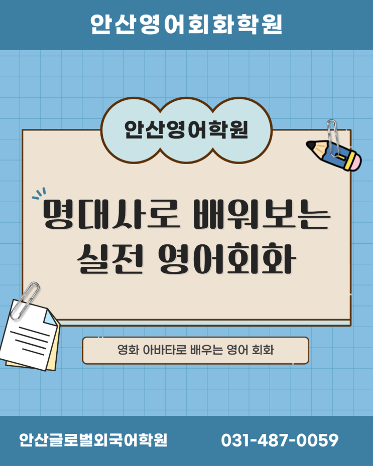 안산 영어학원Ⅰ영화 대사로 영어회화를 배워보는 특별한 방법 안녕하세요 안산영어학원 글로벌 외국어학원입니다 지난 포스팅에서는 안부 인사에 대해 자연스럽게 대답하는 표현을 알려드렸는데요 이번 포스팅에서는 영화로 공부하는 영어회화를 알려드릴 테니 끝까지 봐주세요✨ 아바타는 2009년에 세계적인 흥행을 기록한 영화인데요! 짧지만 강한 메시지를 담은 명대사들 덕분에 회화 연습 자료로 활용하기에도 효과적이에요 감정과 이야기 흐름이 풍부하고 실생활에 바로 써볼 수 있는 표현들이 많아 영어 감정 표현을 연습하기에 정말 좋은 콘텐츠죠! 저희 안산영어학원에서는 이런 감정 중심의 영어회화 훈련도 다양한 방식으로....... <img src="https://blogthumb.pstatic.net/MjAyNTEyMTZfMjA0/MDAxNzY1ODY5NTEyMDYx.-YyKaIeXJKLbxuvNdT6xjtDjvd5SaAOR3q7AzoeBX_Ug.oJV6dr4OEJzbC8PEzpnvhyApc0WbUkkYJ3VDC4SnN6Ig.PNG/%B8%ED%B4%EB%BB%E7%B7%CE_%B9%E8%BF%F6%BA%B8%B4%C2_%BD%C7%C0%FC%26nbsp%3B%BF%B5%BE%EE%C8%B8%C8%AD1.png?type=s3" />