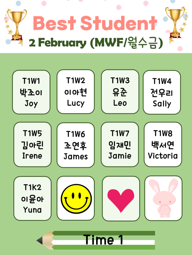 안녕하세요~ 원더프리모 입니다 2026년도 2월 Best Student 들을 소개합니다~ 각 Class별로 최선과 열정을 다하는 학생들이 선정되었는데요! Best Student에 선정된 학생들은 4가지 평가를 기준으로! 1.Class Attitude(수업태도) 2.Monthly Test(월말평가) 3.Attendance(출석) 4. Homework(숙제) 부문에서 애정을 가지고 열심히 노력해준 친구들이 뽑혔답니다~ #배곧원더프리모어학원 #배곧초등영어 #배곧파닉스 #배곧영어회화 #배곧영어학원 #배곧영어 원더프리모어학원 경기도 시흥시 배곧4로 18 원더프리모어학원 & 원더프리모키즈 ↓↓↓ 원더프리모어학원 홈페이지 ↓↓↓ 아이들이 얼마나 자신있게 영어로 소통하는지....... <img src="https://blogthumb.pstatic.net/MjAyNjAzMTFfMjMy/MDAxNzczMjAxNTI5NDQx.nVOtYFbgeT25Zjzsvu8xaCKT0DN35rD8X5kBaAq4sWIg.N_dKgAEl8yxmeIsygtzO2SbaevKiM9-SFY0KuqdoNcsg.PNG/%BD%BD%B6%F3%C0%CC%B5%E51.PNG?type=s3" />