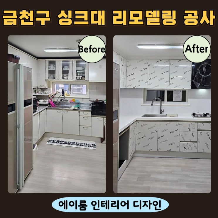 화이트 주방으로 깔끔하게 바뀐 공간, 에이룸 인테리어 안녕하세요 에이룸 인테리어입니다. 오늘 소개해 드릴 현장은 금천구 시흥동 구축아파트 주방 리모델링 현장입니다. 시공 전 주방 모습 기존 주방은 오래된 가스레인지와 후드, 수전과 싱크볼 등 전체적으로 사용감이 많이 느껴지는 상태였습니다. 특히 상판은 대리석과 스테인리스가 혼합된 구조라 디자인적으로 다소 어색한 느낌이 있었습니다. 또한 상부장 높이가 창문에 맞지 않아 전체적인 주방 균형도 아쉬운 부분이 있었습니다. 그래서 고객님께서는 주방 구조는 크게 바꾸지 않으면서 전체 싱크대 리모델링을 진행하기로 하셨습니다. 에이룸 인테리어는 상담과 실측을 통해 고....... <img src="https://blogthumb.pstatic.net/MjAyNjAzMTJfMTg4/MDAxNzczMzI0OTc1NTIw.zkv8_nTte1GRoNxgeZNdomvO60n5YVBxRQQGaANY6fEg.j_455BBOTamOTA4ixt1zQRqDCKEWC-Wvz61AKzHk_EAg.JPEG/%C0%FC%C8%C4%BB%E7%C1%F8_%281%29.jpg?type=s3" />