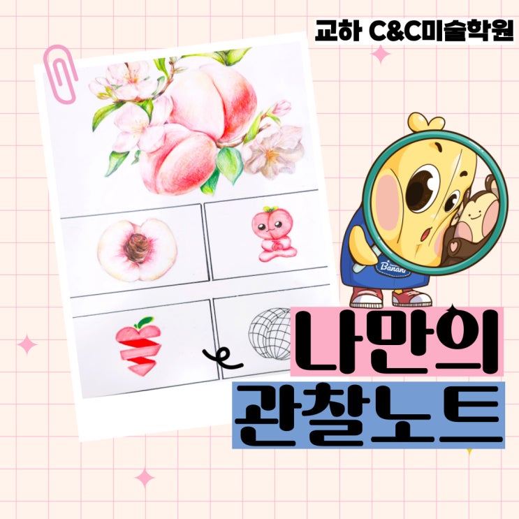 안녕하세요~ 교하 중심상가 롯데리아 건물 5층에 있는 교하씨앤씨 미술학원입니다 이번 고학년반에서는 ‘나의 관찰 노트’ 수업을 진행해보았어요 요즘은 중학교에 올라가면 미술도 그림만 그리는 게 아니라, 관찰하고 분석하고 응용까지 이어지는 융합형 수행평가로 진행되는 경우가 많더라고요. 아이들이 공부는 전반적으로 잘 해내고 있는 편이라 이제는 한 가지만 잘하는 게 아니라, 보고 이해하고 표현하는 힘까지 함께 키워줘야 하는 시기라는 생각이 들어서 만들어본 수업이랍니다^^ ‘얼마나 잘 그렸는지’보다는 ‘얼마나 제대로 들여다봤는지’에 초점을 두고 진행해보았습니다. 먼저 주제부를 확대해서 형태랑 질감을 천천히 세....... <img src="https://blogthumb.pstatic.net/MjAyNjAyMjVfMTE0/MDAxNzcyMDIxMzMzNDE1.TBcbvObg0Drt-1ruLElqaUGrPuFl2HBKcNbQFk49lmAg.XBf6p4YOE4LFvVxvNQGh1XKQhWcUVdKhCBlM4lliwbQg.JPEG/%C1%A6%B8%F1%C0%BB-%C0%D4%B7%C2%C7%D8%C1%D6%BC%BC%BF%E4_-002.jpg?type=s3" />