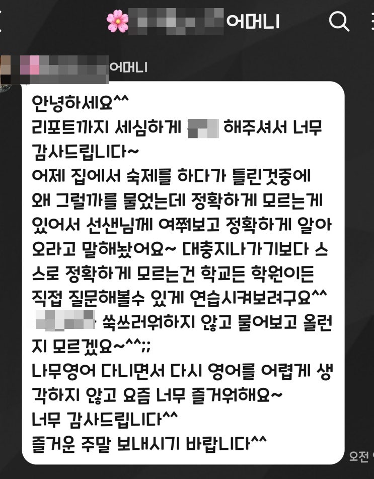 “분명히 모두 알고 있는 단어들인데, 왜 해석을 못할까요?” “문장을 끝까지 읽긴 읽는데, 무슨 뜻인지 모르겠다고 하네요...” 아이를 지켜보는 부모님의 마음, 누구보다 답답하실 겁니다. 리딩이 막히는 많은 경우, 아이가 부족해서가 아닙니다. 리딩이 막히는 대부분의 경우는 아이들이 '문장 구조'를 '정확히 이해하지 못했기 때문'입니다. 리딩이 막히는 순간, 그 해결의 출발점은 영문법에 있습니다. 소수 학생의 실력 성장을 개인별로 관리하는 나무영어교습소에서는 영문법을 단순히 시험을 위한 과목으로 가르치지 않습니다. 아이들이 영어 문장을 스스로 이해할 수 있도록 돕는, 기초이자 토대로 지도합니다. 영....... <img src="https://blogthumb.pstatic.net/MjAyNjAyMTlfMTcz/MDAxNzcxNDY0Nzg4Mzg0.R25tSzzSXcG5VuEdfI8EH5JjXyxmYQNKYOXCVqhjWpwg.Spn53t4TVeb3XCfZXaeY6UW31poK7wUt9z8iW203R5cg.JPEG/IMG%A3%DF9417.jpg?type=s3" />