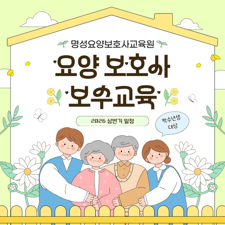 안녕하세요! 서울 성북구와 강북구 지역 어르신 돌봄의 중심, 명성요양보호사교육원입니다. 오늘은 현직 선생님들을 위한 2026년 보수교육 상세 일정과 함께, 새롭게 요양보호사의 길을 걷고자 하는 분들을 위한 5월 신규 자격 취득 과정 개강 소식을 한 번에 전해드립니다! [현직자] 2026년 요양보호사 보수교육 안내 장기요양기관 현장에서 애쓰시는 선생님들, 올해 교육 대상 여부를 확인해 보세요! 교육 대상: 장기요양기관 근무 중인 짝수년도 출생 요양보호사 면제 대상: 2024년 ~ 2025년 요양보호사 자격시험 합격자 교육 일정: 매월 4주차 토요일 (4, 5, 6, 7, 8, 10, 11월 운영 / 9, 12월 휴강) 교육 시간: 09:00 ~ 18:00 (총 8시....... <img src="https://blogthumb.pstatic.net/MjAyNjAzMjZfMjc3/MDAxNzc0NTAzNjg4OTc1.WBTNkyEyVlJhKV2Wv3VthojZmr0xN6c4roQj-b9oLF0g.ei5RfpBCyWdv3XcVPGc-kfvo9jeu_TvRe1g7FVAIt8gg.JPEG/%C1%A6%B8%F1%C0%BB_%C0%D4%B7%C2%C7%CF%BC%BC%BF%E4_%2896%29.jpg?type=s3" />