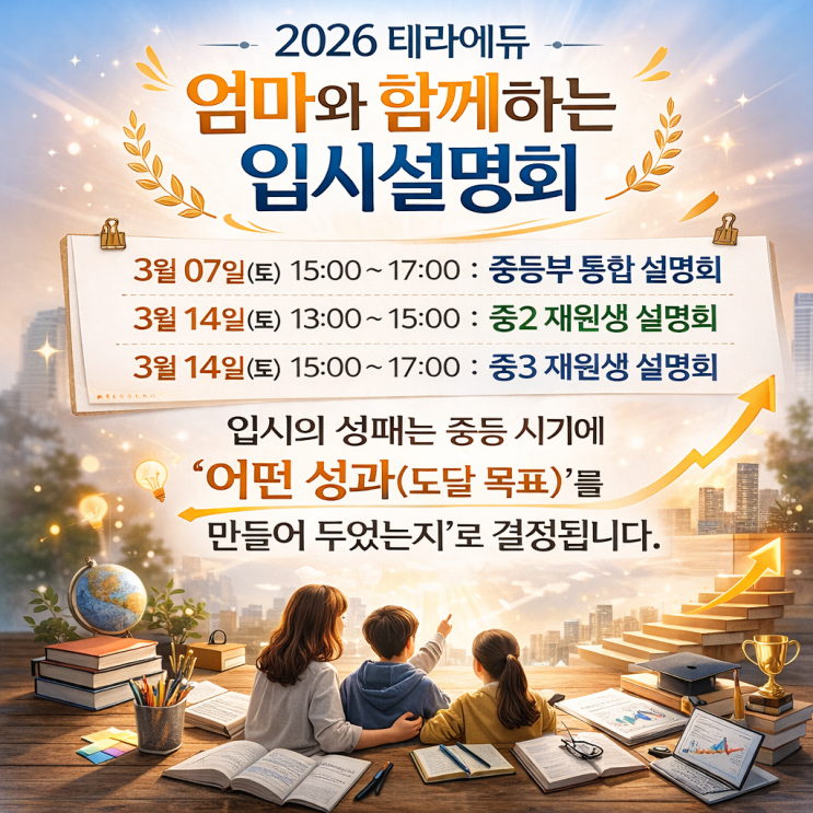 테라에듀 중1, 2, 3 재원생대상 "엄마와 함께 하는 설명회" 안녕하세요 테라에듀 학원입니다. 입시는 고3에서 갑자기 시작되지 않습니다. 입시의 성패는 중등 시기에 ‘어떤 성과(도달 목표)를 만들어 두었는지’로 결정됩니다. 이번 설명회에서는 단순히 “열심히 하자”가 아니라, 중1~3 시기에 반드시 만들어야 하는 ‘입시 성과와 완성도’를 기준으로 입시(내신·수능)의 플랜을 명확하게 제시합니다. 중학교 내신은 ‘암기’로 버틸 수 있어 보이지만, 고등으로 올라가면 수능형 독해·논리 구조가 요구됩니다. 많은 학원에서 영어 독해 모의고사를 진행합니다. 하지만, 수능에서 최종 1등급과 명문대 타이틀을 거머쥐는 학생들은....... <img src="https://blogthumb.pstatic.net/MjAyNjAyMjVfMTgy/MDAxNzcxOTc1ODE3Nzg4.cXa8LEVU3AqA5wXZpMcPvXSQ9n0grhsIe9XCJSfMIvMg.2N9UkirGUvnOytDTpXbrdnvPGbB1MPoFIKV9pDYAwMIg.PNG/26_%BE%F6%B8%B6%BF%CD_%C7%D4%B2%B2%C7%CF%B4%C2_%C0%D4%BD%C3%BC%B3%B8%ED%C8%B8_%C1%DF2%2C%C1%DF3.png?type=s3" />