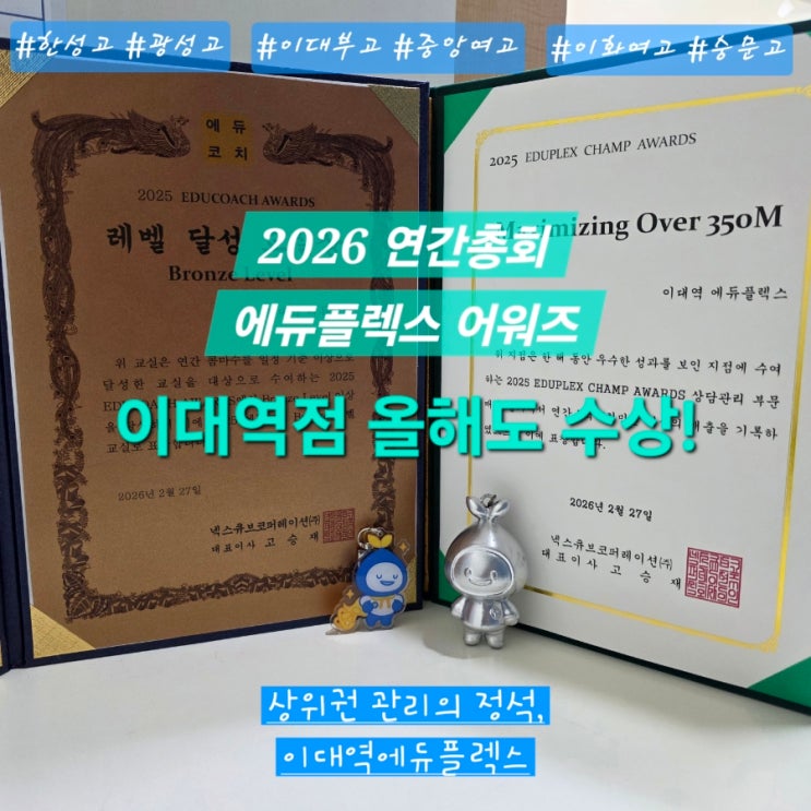 상위권 관리의 정석, 이대역에듀플렉스 2026 연간총회 에듀플렉스 어워즈 작년에 이어 올해도 수상했습니다. 남녀 구분 좌석제 운영 시험기간 주말 텐투텐 운영(일요일 무휴) 국영수사과역 전과목 All in One 학습 시스템 ✅️ 문의 02-313-0335 ✅️ 이대역 1분 거리 ✅️ 이대역푸르지오시티 상가 111호 아이들의 자기주도학습 완성을 위해 항상 노력하겠습니다. 감사합니다. #마포프레스티지자이 #마포그랑자이 #마포더클래시 #대현럭키아파트 #신촌이편한세상 <img src="https://blogthumb.pstatic.net/MjAyNjAzMDVfNjMg/MDAxNzcyNjM5OTIxMjA2.r_RAC_Paj9d_zBWUjIDfFmgzQz0e65-beaJxuT0ButMg.lLkc7ziChfPZUcF7BPhmKLO7HutSqX9Q_pmkxee3NEsg.JPEG/900%A3%DF20260304%A3%DF163716%A3%A81%A3%A9.jpg?type=s3" />