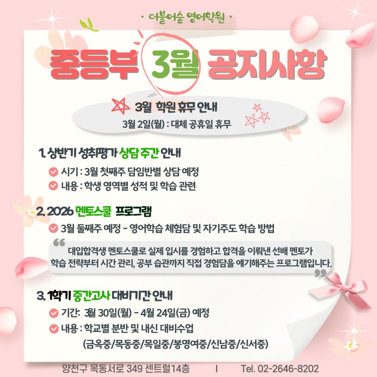 안녕하세요. 더불어숲영어학원입니다. 춥고 길게만 느껴지던 겨울방학이 끝나고 어느덧 새 학기가 시작되는 3월을 맞이했습니다. 새로운 교실, 새로운 선생님, 새로운 목표 앞에서 아이들도 설렘과 긴장 속에 첫걸음을 내딛고 있을 시기입니다. 3월은 새 학년이 시작 뿐만 아니라, 아이의 한 해 학습 방향을 자리 잡는 중요한 시기입니다. 더불어숲영어학원은 아이들이 새 학기를 흔들림 없이 출발할 수 있도록 상담, 멘토스쿨, 내신 대비 등 다양한 프로그램을 꼼꼼히 준비했습니다. 아래 3월 중등부 주요 공지사항을 참고하시어 가정에서의 학습 계획에 도움이 되시길 바랍니다. 3월 학원 휴무 안내 3월 2일(월) : 대....... <img src="https://blogthumb.pstatic.net/MjAyNjAyMjFfMTc2/MDAxNzcxNjQ3ODExNzc1.S97SAgxtk8MD5eHHS4v51P73-CcnRY-pskqg7Zjf238g.fWl67fsonIT-iunfqHEW9ptwkV1WkcHLFy81ERvMo8Eg.JPEG/003_%282%29.jpg?type=s3" />
